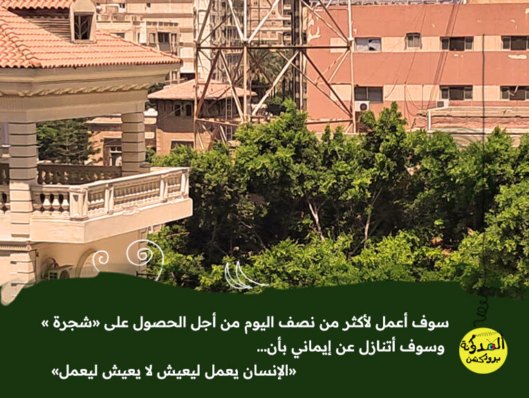 بدأت رحلة البحث عن شقة مستقلة عن بيت العائلة لا تزيد عن غرفتين بشرط أن تكون في مكان حوله شجر، لكن المشكلة أن الايجارات في الأماكن التي تصلح للعيش مرتفعة للغاية، والحل الوحيد كان في قبول مشروعات عمل جديدة تجعل ساعات عملي اليومية تزيد عن 12 ساعة،  سوف أعمل لأكثر من نصف اليوم من أجل الحصول على شجرة  وسوف أتنازل عن إيماني بأن “الإنسان يعمل ليعيش لا يعيش ليعمل”..في النهاية وجدت مطلبي في شقة بمنطقة “زيزينيا “، البيوت حولي قصيرة وقديمة، وغرفتي تطل على فيلا بها الكثير من الأشجار يسكنها طيور تهوى الثرثرة، لكني أحبها.